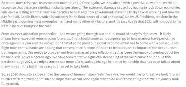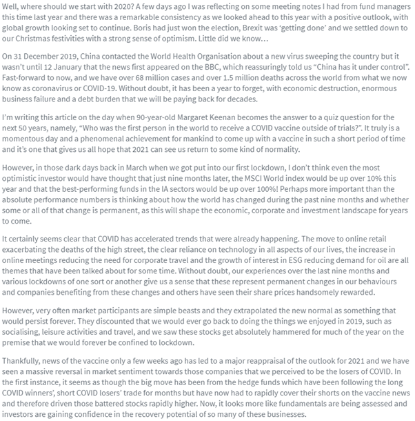 Please see below an article published late yesterday by A.J. Bell, which looks back on the initial outlook for 2020, in contrast to what was experienced and what we might see in 2021: