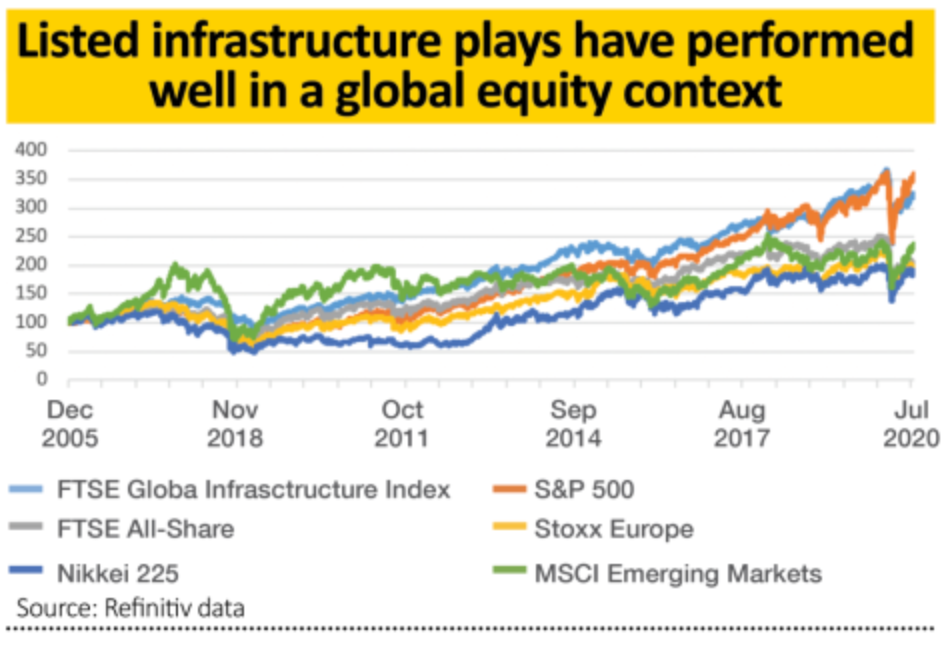 Several REITs have cut their dividend and over £40 billion of cut, cancelled, suspended or deferred dividends in the UK stock market alone since March leave income-seekers in a bind, especially as government bonds offer little joy either. Infrastructure could again play a role here, as shown by the investment trusts which specialise in this area – though it must be noted that there are open-ended funds which operate here, too, and even a couple of passive, exchange-traded funds (ETFs) which track the performance of a basket of listed infrastructure stocks.