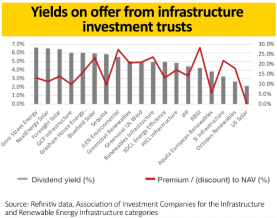 Note the yields on the investment trusts range from 2.1% to 6.6% for renewables specialists and from 3.2% to 6.2% for infrastructure experts.