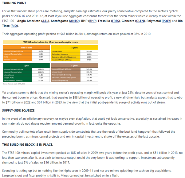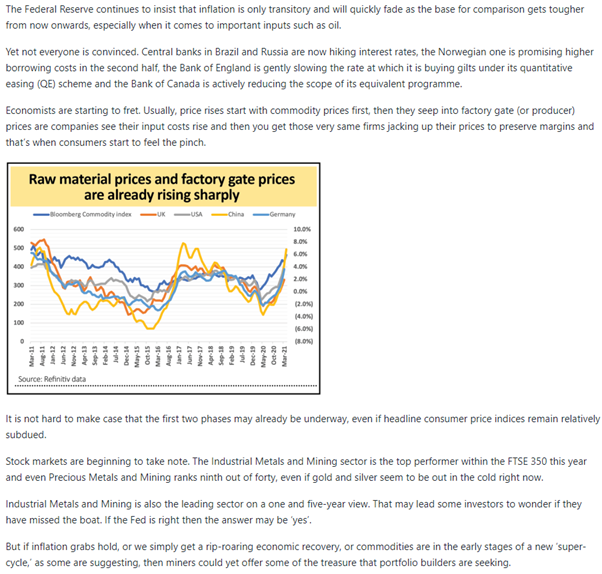 Please see below an article received from A.J. Bell which was received yesterday (16/05) and details their views on inflationary pressures and where industrial metals and mining could play a role: