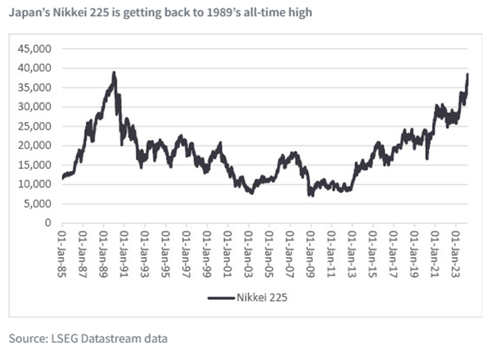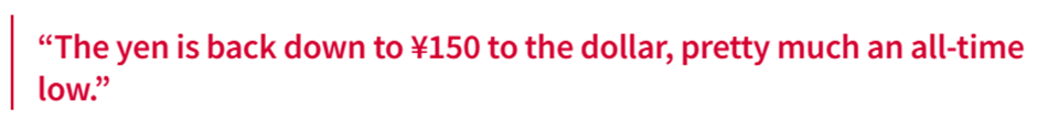 A currency that continues to slide. The yen is back down to ¥150 to the dollar, pretty much an all-time low. This helps to attract overseas buying (as the cheap currency is an added bonus on top of what may be cheap stocks) and boosts exporters at the same time (like those technology and industrial companies in which Japan specialises).