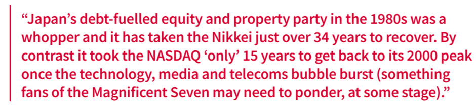 - The bigger the bubble, the bigger the hangover is likely to be. Japan’s debt-fuelled equity and property party in the 1980s was a whopper and it has taken the Nikkei just over 34 years to recover. By contrast it took the NASDAQ ‘only’ 15 years to get back to its 2000 peak once the technology, media and telecoms bubble burst (something fans of the Magnificent Seven may need to ponder, at some stage).