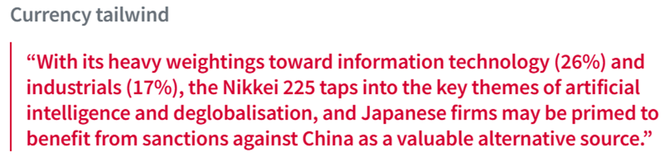 With its heavy weightings toward information technology (26%) and industrials (17%), the Nikkei 225 taps into the key themes of artificial intelligence and deglobalisation, and Japanese firms may be primed to benefit from sanctions against China as a valuable alternative source. A low weighting toward financials (3%) is also noteworthy, as banking stocks in the USA and UK continue to flounder.