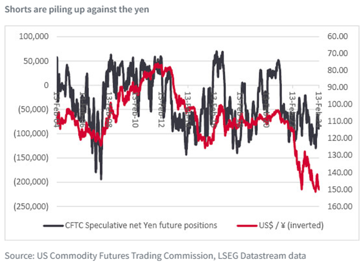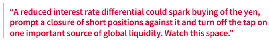 This matters because the Bank of Japan is, in theory, inching its way towards a first interest rate hike, just as the western central banks are laying the groundwork for their first cuts. A reduced interest rate differential could spark buying of the yen, prompt a closure of short positions against it and turn off the tap on one important source of global liquidity. Watch this space.