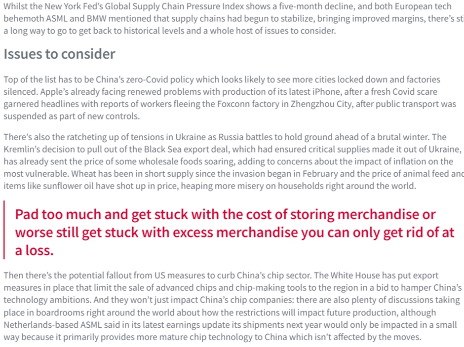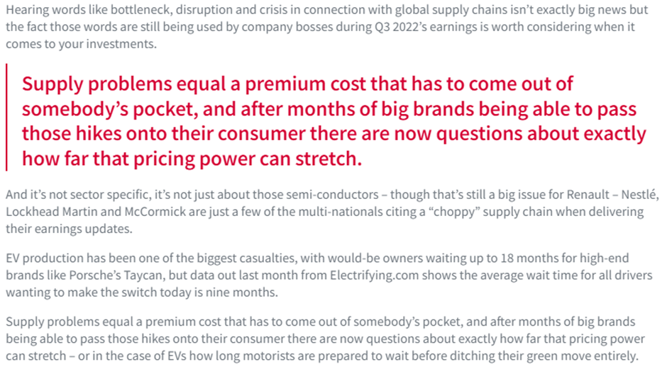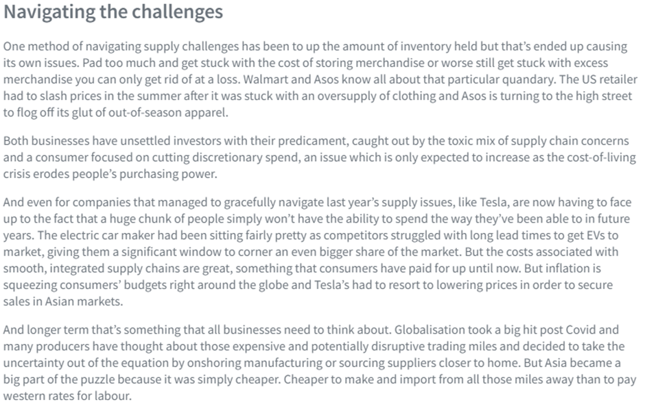Please see below an article published by AJ Bell on Saturday (05/11/2022) and received yesterday afternoon, which covers their views on the global supply chain issues:
