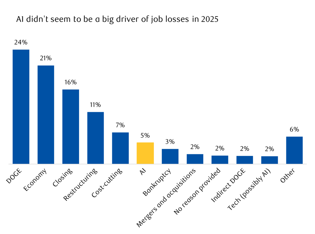 - … but AI’s not to blame: Despite concerns over AI-related job losses, the Challenger Report showed that AI has only accounted for 3% of layoffs since 2023.