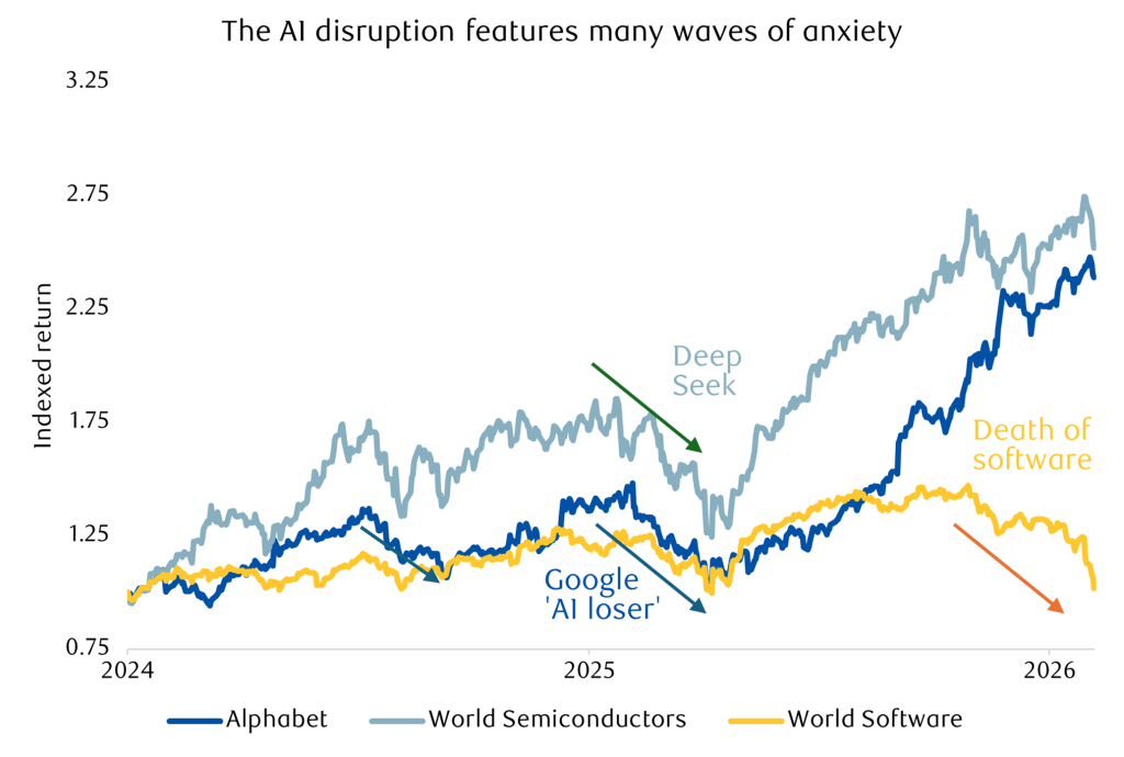 The compromise came too late for some of last week’s anticipated jobs data releases, which have been delayed as a result. It’s a shame, because jobs growth has been slowing this year, and the interest rate outlook is uncertain. Compounding concerns, the week saw a further step up in the anxiety investors are feeling over the effects of AI on companies and workers.
