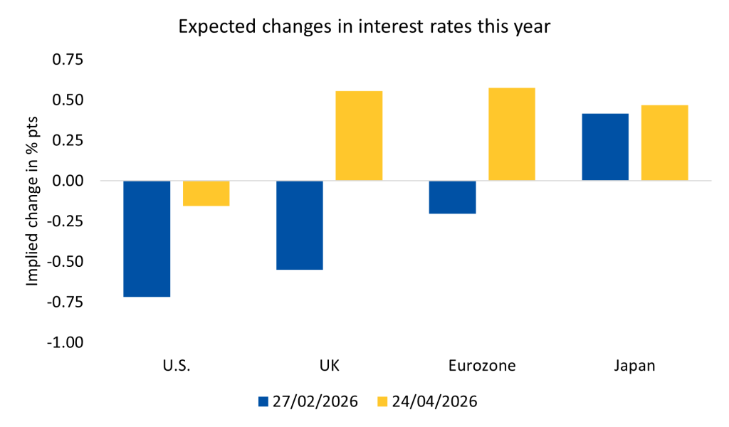UK inflation data released last week offered few surprises. Inflation has picked up due to energy. The combination of the survey data and PMIs caused expected interest rates to rise from a single increase in 2026 to two hikes for both the UK and Europe.