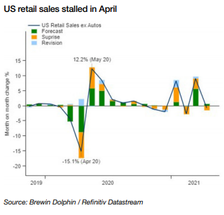 Last week also saw the release of the latest US retail sales data, which showed sales unexpectedly stalled in April as the boost from stimulus cheques faded. Economists had been expecting a rise of between 0.8% and 1.0% from the previous month. However, the increase came after a 10.7% surge in March, an upward revision from the previously reported 9.7% increase.