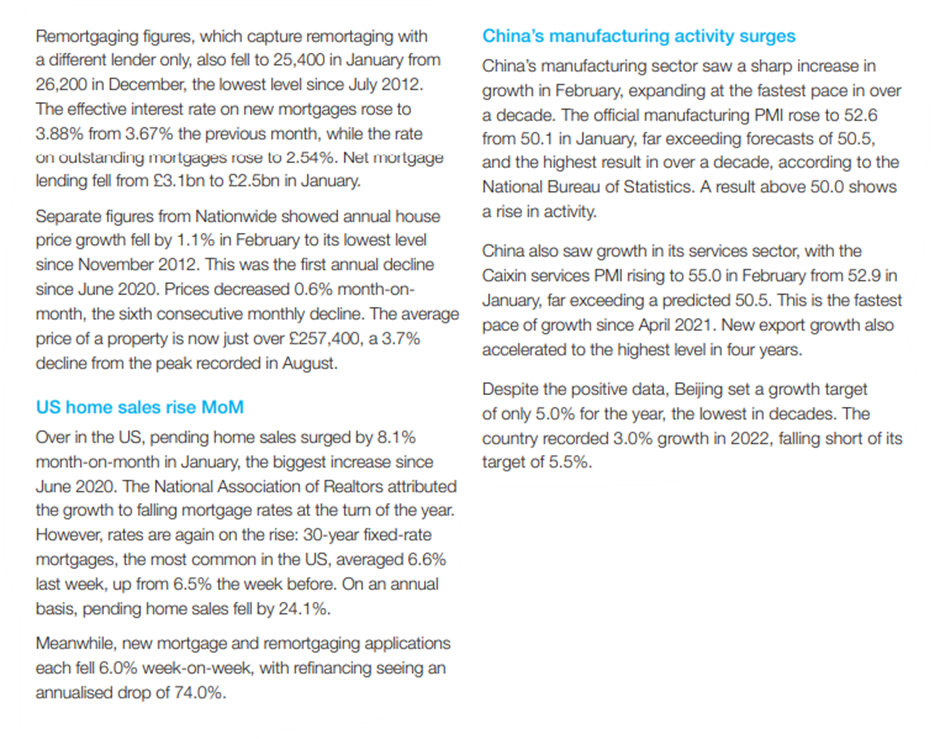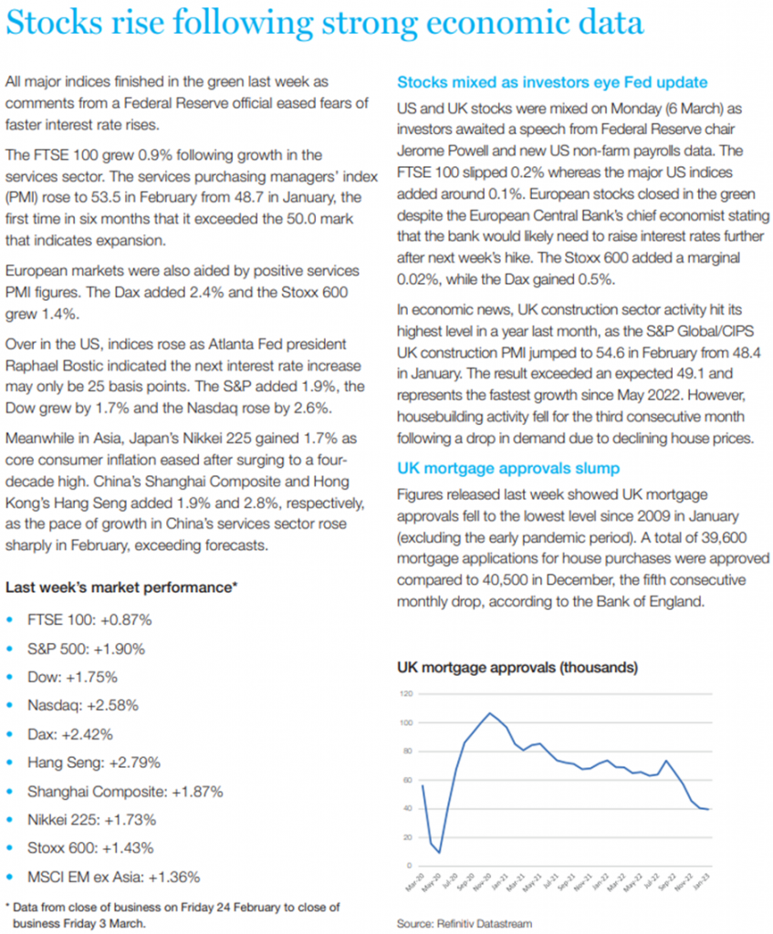Please see below, Brewin Dolphin’s ‘Markets in a Minute’ article summarising the key economic and markets news from the past week. Received late yesterday afternoon – 07/03/2023