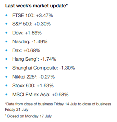 In the US, the Dow enjoyed its tenth consecutive day of gains on Friday – its longest winning streak since August 2017. The Dow ended the week up 1.9%, boosted by comments from Treasury secretary Janet Yellen that the risk of a US recession had fallen. Disappointing technology sector earnings weighed on the Nasdaq, which lost 1.5%. In Asia, the Shanghai Composite and the Hang Seng fell 1.3% and 1.7%, respectively, after figures showed China’s gross domestic product (GDP) grew by just 0.8% in the second quarter, down from the first quarter’s 2.2% expansion.