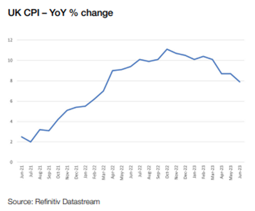 Last week saw the UK’s Office for National Statistics publish the closely watched consumer price index (CPI) report. The headline rate of inflation eased to 7.9% year[1]on-year in June, down from 8.7% in May and lower than expected. This was mainly driven by a 22.7% year-on[1]year decline in motor fuel prices. Food and drink inflation eased to 17.4% in June from 18.4% in May. Core inflation, which excludes energy, food, alcohol and tobacco, slowed to 6.9% in June after hitting a 30-year high of 7.1% in May.