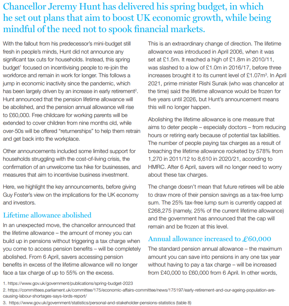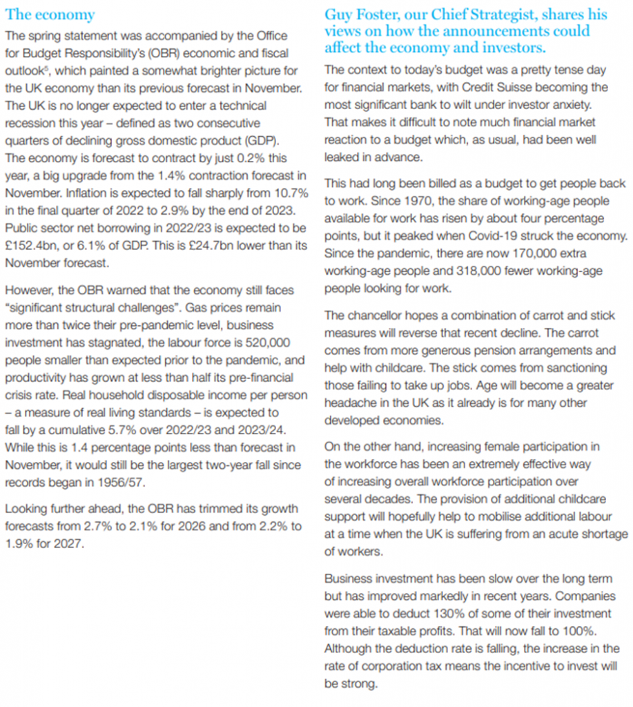 Please see below an article published and received late yesterday (15/03/2023) evening from Brewin Dolphin, which provides their summary of the Chancellor’s Spring Budget which he delivered yesterday: