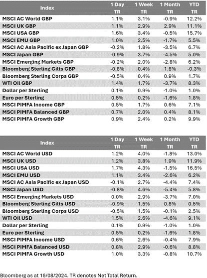Equity markets were in confident mood on Thursday. Buoying the economic outlook and pushing back on recession worries, yesterday’s US weekly initial jobless claims data was better than expected for the second week running. Initial claims fell by -7,000 in the week to Saturday 10th August, to 227,000 and below the Bloomberg consensus estimate of 235,000. The continuing claims number also fell. Reflecting the better news, the US S&P500 equity index ended yesterday up +1.61% in US$ terms. It is now up +8.28% above the intra-day low it reached last Monday (5th August) and is now only -2.19% below its record all-time high … a reminder for investors of the risks of trying to time short-term market exit and entry points. Within equity markets, as well as megacap US tech shares leading, smaller company share prices also outperformed with the US Russell 2000 equity index up +2.45% having its best day in four weeks. European equity markets also gained on Thursday, with the UK, French, and German equity markets all up on the day.