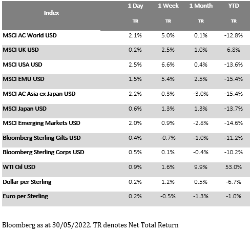 US equity markets broke their 7-week losing streak last week, seeing a strong rally which was led by consumer discretionary stocks as discount retailers posted better earnings than expected. Bond markets also shared this rally as investors priced in a less aggressive pace of tightening from the Federal Reserve in the face of declining economic momentum. This week is likely to be quieter with the US on holiday today for Memorial Day and the UK off on Thursday and Friday for the Queen’s Platinum Jubilee.