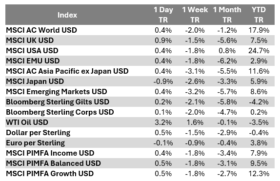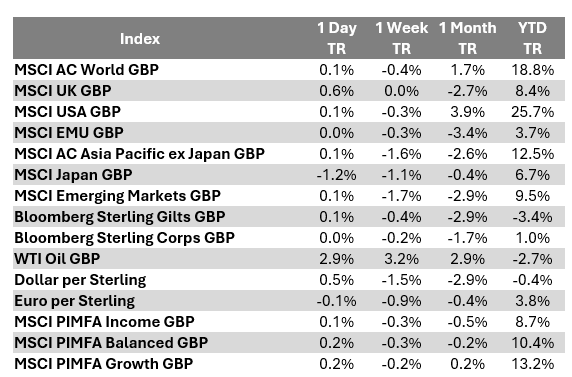 It was non-US stocks’ time to shine this week and none shone brighter than the UK. Encouragingly, gains in the FTSE 100 (which is dominated by multinationals) were almost identical to the FTSE 250 (whose companies are more sensitive to the domestic economy), suggesting a broad improvement. This was helped by the continued fall in government bond yields, making equities more attractive by comparison. Thankfully, we seem to be over the gilt market anxiety seen a few weeks ago.
