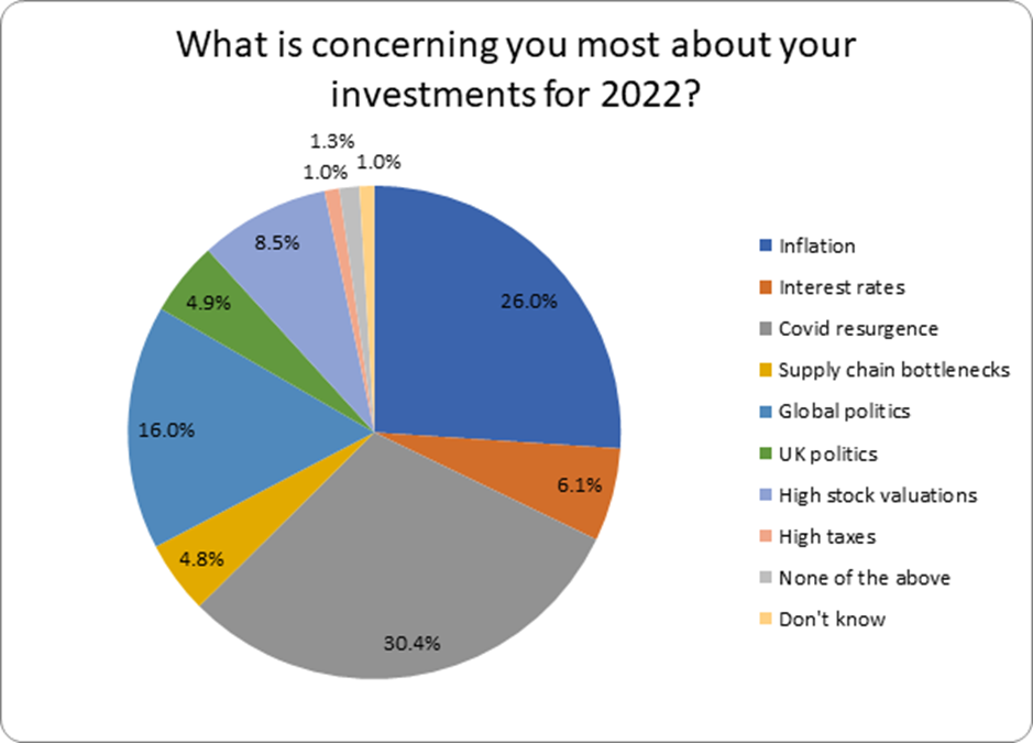 DIY investors are entering 2022 in a mood of constructive realism, recognising market risks, but also largely confident in their investments. Six in ten expect further covid restrictions in 2022, and a resurgence in the pandemic is the number one worry for investors as we head into the new year. Indeed, covid is seen as a greater risk than inflation, which makes sense seeing as the stock market provides some protection from price rises. Inflation comes a close second in the list of concerns for 2022 though, which shows investors are wary of price rises and the effect this may have on their portfolios. Global politics and high stock valuations are also cause for concern for some investors.