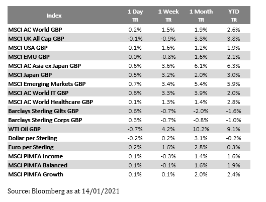 Equity markets retained a constructive tone yesterday, but it was really bond markets that did the most travelling. Initially US Treasury bond yields fell as markets continued to digest the series of Fed governors who reassured bond investors that they would remain accommodative for the foreseeable future. Overnight however, Bloomberg reported that President-elect Biden’s administration would be seeking a bi-partisan $2 trillion bill which led the decline in yields to reverse. The interplay of the nascent economic recovery, fiscal stimulus and monetary stimulus will be a key theme of 2021.