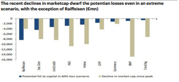 From the list above, the bank with largest risk to Russia is UniCredit. Whilst there is headline risk, we note UniCredit is holding 1yr of normalised provisions in precautionary provisions today (scope 1 & 2). In earnings terms Russia is c3-5% of group only and the assets are well capitalised (18.8% CET1 vs 10% required). Using a 1998 losses analysis means a loss of 90bps CET1 however, walk-away and that loss is estimated at -50bps only (given this would also reduce RWA). This compares to last reported CET1 of 14.1% and co target of 12.5-13% so they have the means to absorb a worst case scenario without fresh equity: this is not a repeat of the GFC.