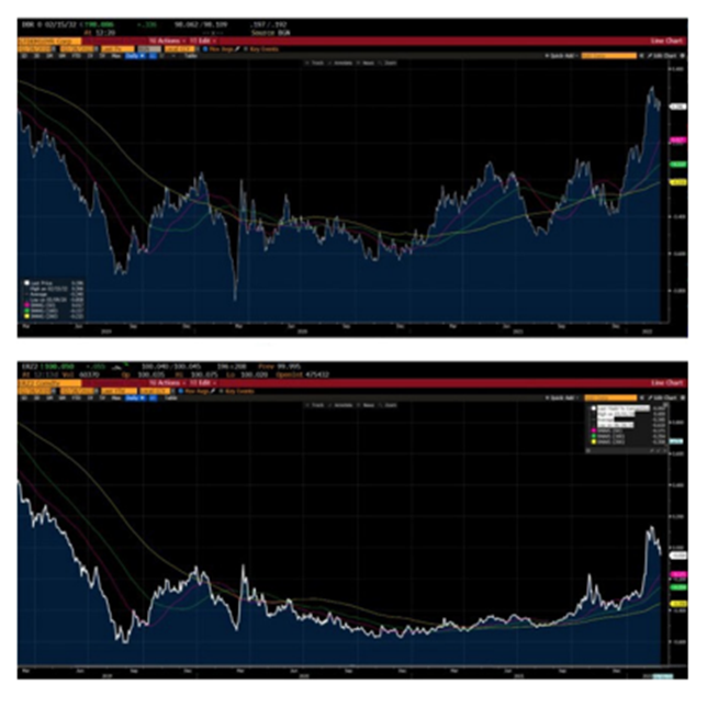 To that point it’s worth highlighting what’s happening in the debt markets vs equity. German 10Y bond yields have moved lower, but as per the chart below we’re at +20bps yield today vs -40/-60bps for much of 2021. Likewise the 3month Euribor (second below) is far from 2021 levels which is where the European banks have retrenched back to.
