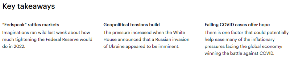 As you can see from the above, inflationary pressures globally are having a big impact on markets and the Fed’s outlook and proposed rate hikes by Q2 2022 have also impacted on investor sentiment. Supply chain issues also remain an issue and this could potentially be further exposed by events in Russia and possible sanctions that could be imposed.
