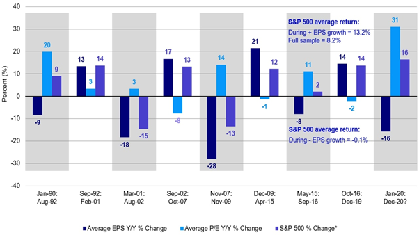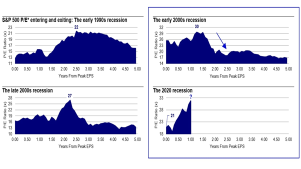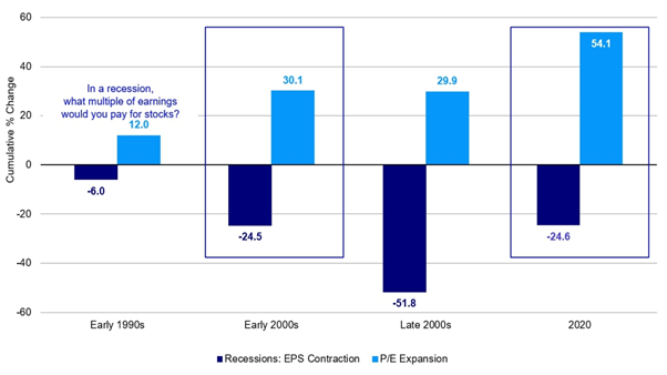 Figure 1. Like clockwork, earnings fell and multiples rose during each of the last 3 recessions, and this one was no exception
