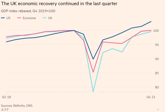 In the UK, GDP growth of 7.5% was reported for 2021, which put the economy roughly back to where we were before the pandemic started back, this time two years ago. The chart below illustrates how the V-shaped recovery has not only taken place in the UK, but also Europe, while the US is the outlier that has surpassed the starting level. As we know, this was substantially achieved by larger and less targeted handouts by the US government that resulted in a significant consumer demand boost. The increased levels of inflation are, to a large extent, the undesired side effect of this necessary, but hard to fine-tune, bridging support for the affected population.