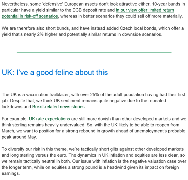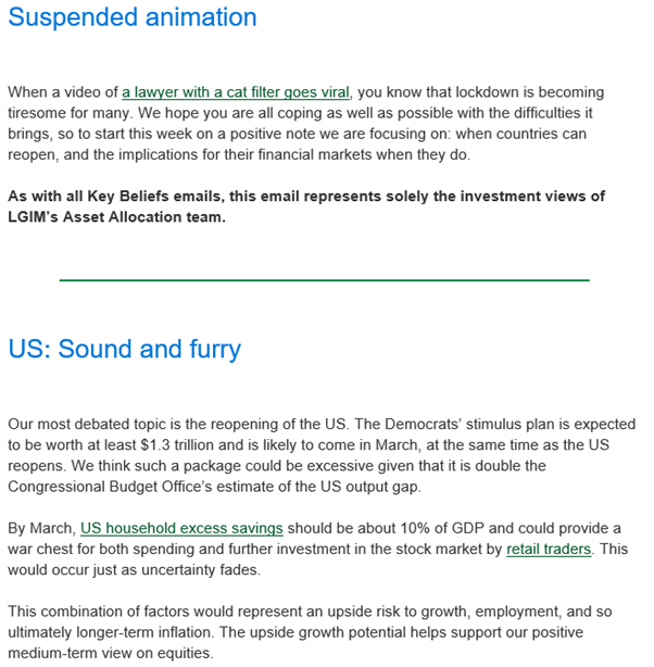 As you can see from the above, the U.S. has a couple of key themes to keep an eye on namely the scale of the stimulus package that will be announced and inflation. It looks like L&G are positioning for a potential correction in U.S. equity prices. On Europe, they see less opportunity in the short-term and this won’t be helped if their economies have to remain in lockdown until May. Their views on the U.K. are more optimistic, although they remain cautious over potential inflationary pressures.