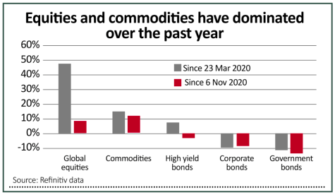 Fear may have dominated a year ago, but equities have been the best place to be over the past 12 months. As benchmarked by the MSCI All World index, global stocks have beaten commodities and bonds. Government bonds, in theory a port in a storm, have provided no shelter with capital losses more than offsetting any yield that they offered.