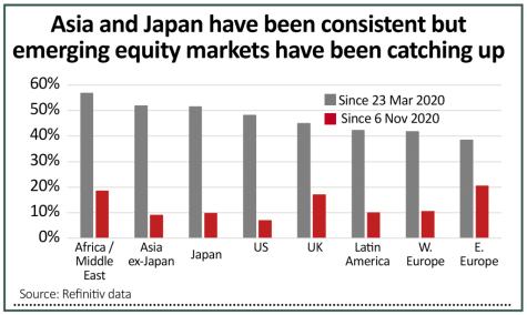 America’s domination of early 2020 has faded and it is prior laggards who have come to the fore – emerging markets and even the unloved UK equity market has put on a spurt, finding itself outpaced by just Eastern Europe and the Africa/Middle East region since November. This may be down to the perception that the UK is ahead of the game when it comes to vaccination programmes, having previously struggled to contain the virus.