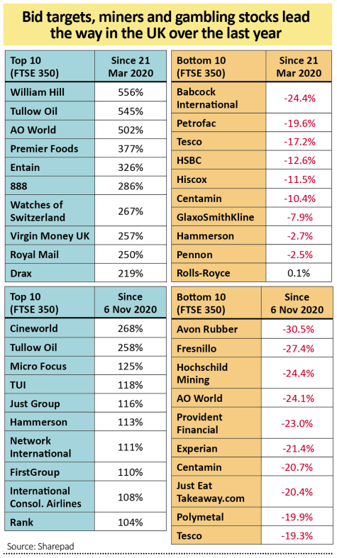 These ‘big picture’ trends – a switch from defensives to turnaround plays, from ‘growth’ (and promises of long-term secular growth, or ‘jam tomorrow’, almost regardless of the economic backdrop) to ‘value’ (cyclicals that offer growth now, or ‘jam today,’ in the event of a recovery), from pandemic winners to bounce-back candidates can be seen on a bottom-up basis in how individual UK-quoted stocks have performed
