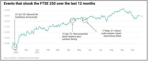 The more UK-facing FTSE 250 index has endured a year of uncertainty. Covid hasn’t run in a smooth line, lockdowns have had to be re-implemented, ‘Freedom Days’ have had to be shifted and sometimes the expected benefits are undone by crises like the ‘pingdemic’ which saw many businesses scrabbling to find the staff they needed just to keep operations going.