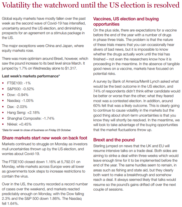 With one week left until the US Election, the surge of Covid infections worldwide, and the Brexit deadline looming we don’t expect the market volatility to subside just yet!