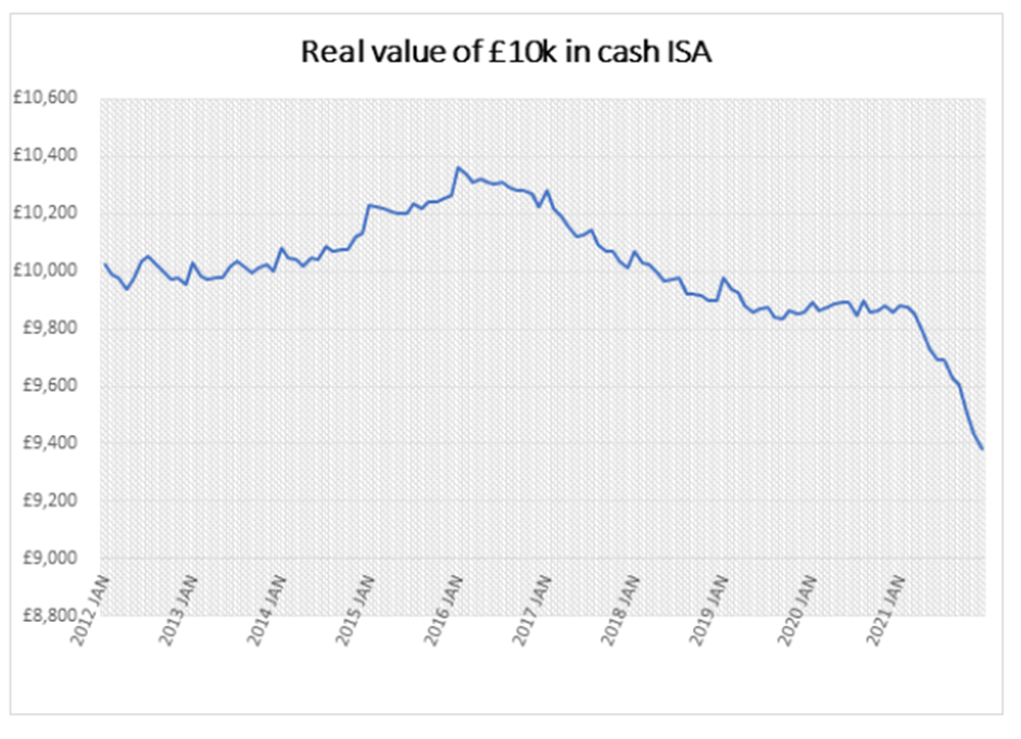So despite interest rates falling to rock bottom over the last ten years, worse may yet be in store for cash savers. Longer term, higher rates should be positive for Cash ISA savers, if inflation tails off in the way the Bank of England expects. If it doesn’t, the last ten years of slow and steady inflationary erosion could end up looking like a walk in the park.