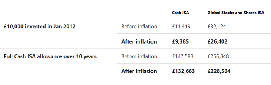 By contrast the average Global Stocks and Shares ISA (invested in the IA Global fund sector average) has turned £10,000 invested into £26,402 over the same period, after adjusting for inflation. If you had saved your full Cash ISA allowance over these ten years, equivalent to £142,220 of contributions, that would now be worth £132,663 in real terms, if saved in the average Cash ISA. If invested in the average Global Stocks and Shares ISA instead, it would be now worth £228,564, after adjusting for inflation.