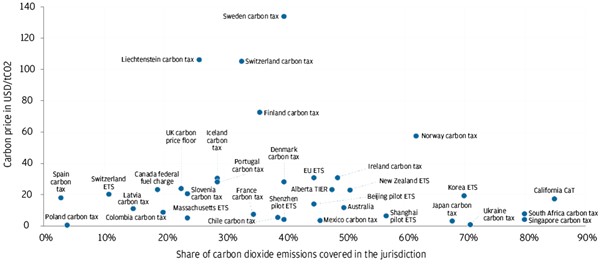 Carbon prices in USD (as of 1 November 2020) and % share of carbon dioxide emissions covered in the jurisdiction.