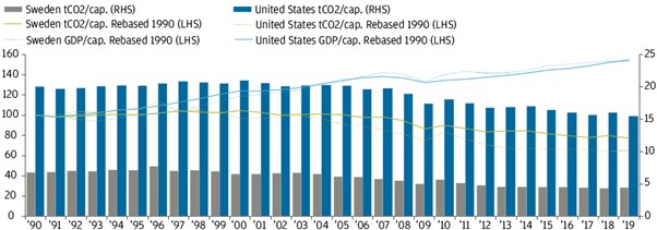 Exhibit 3: Economic and carbon performances of Sweden compared to the US, 1990-2019