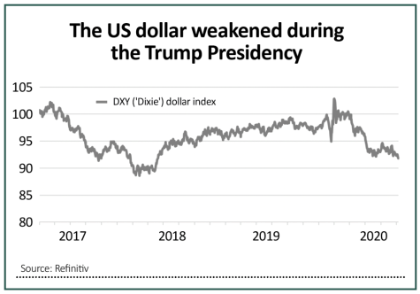 The dollar has fallen 9% since his inauguration on 20 January 2017, using the trade-weighted basket of currencies that makes up the DXY (or ‘Dixie’) index as a guide, and now trades at a two-and-a-half-year low.