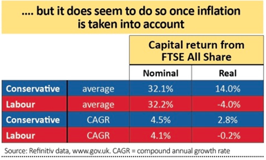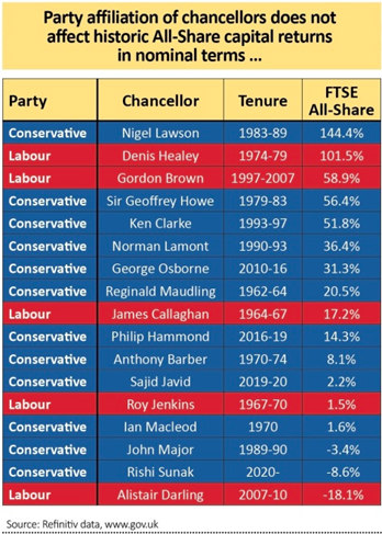 At first glance, there is nothing in it between the two parties. Under Conservative chancellors, the FTSE All-Share has chalked up a total capital gain of 355%, in nominal terms.