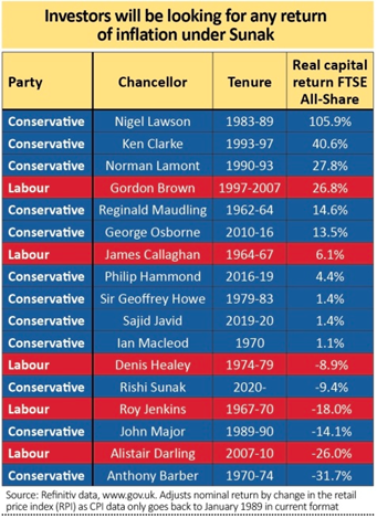 Investors will be looking to their portfolios to gauge the effect of his policies and history suggests that the UK stock market has, for whatever reason, done better on average under Conservative chancellors than Labour ones, at least once inflation is taken into account.