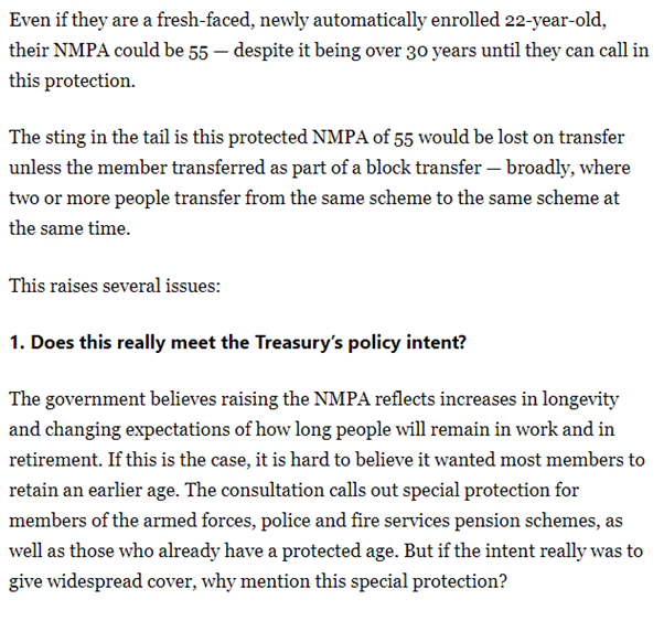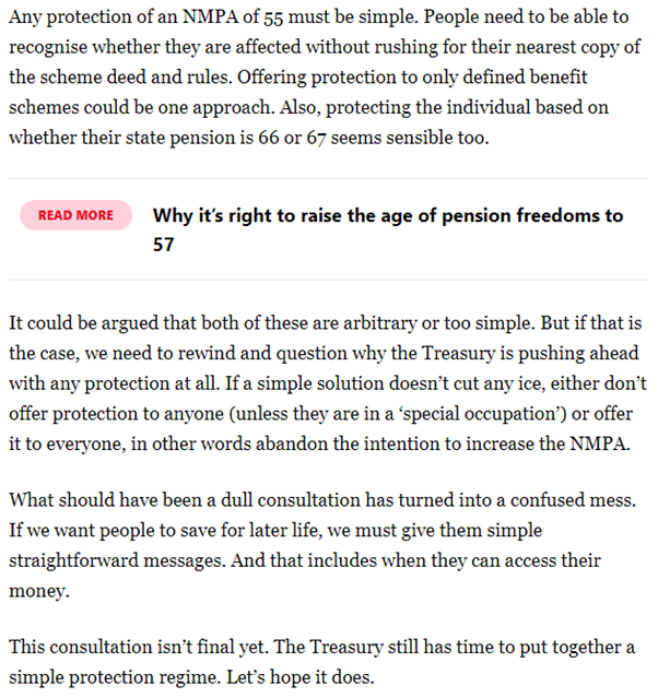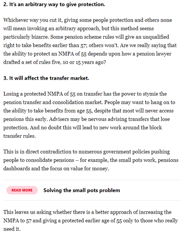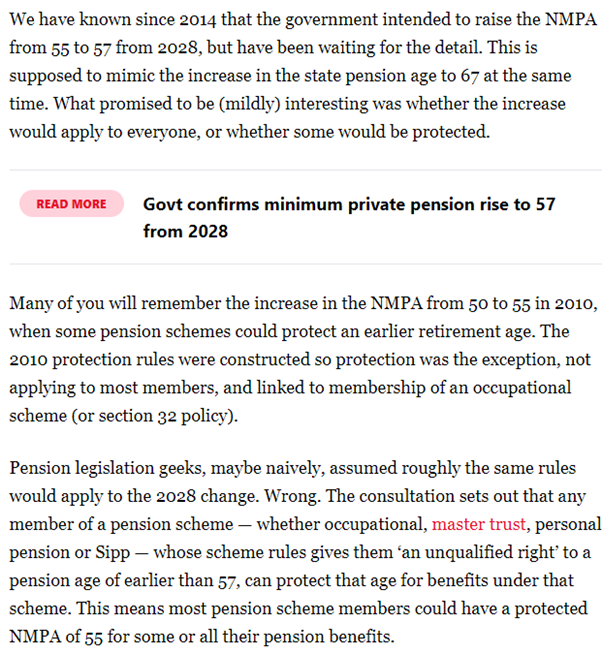 I think the above article helps highlight some of the key factors that will need to be factored in when considering possible pension consolidation exercises or general pension switches. It could be that to switch your pension to a new provider in the future could mean you losing a minimum pension age of 55 under the existing contract and instead not being able to access your pension benefits until age 57.