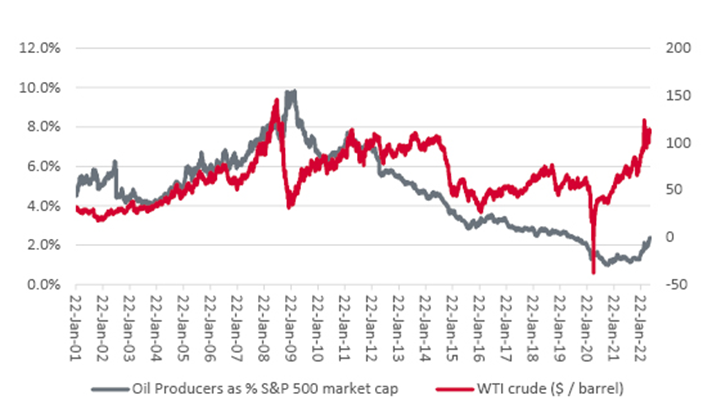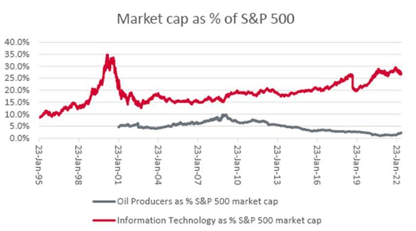 In the USA, the major oil producers command an aggregate market capitalisation which represents just 2.4% of the S&P 500 index’s total $33 trillion price tag. Granted, that is a big leap from the lows of autumn 2021 but it is barely a quarter of the highs seen in the middle of this millennium’s first decade.