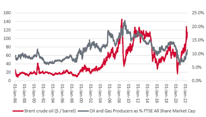 It is therefore interesting to note that oil stocks still represent only 11.4% of the FTSE All-Share’s market capitalisation, compared to historic highs north of 20%, when oil also traded consistently above $100 a barrel.