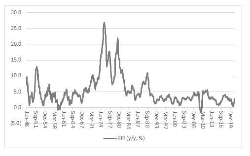 Back then inflation, as measured by the retail price index (for which there is a longer dataset), was roaring away in the twenties. That hurt consumers’ spending power, as their savings lost value in real terms, and dissuaded companies from investing, as the returns on any new projects could not compete with the double-digit interest rates on offer.
