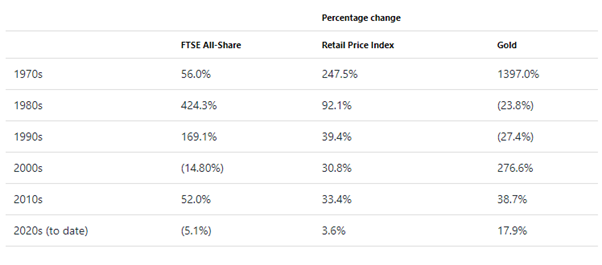 The FTSE All-Share rose by a perfectly respectable 56% in the 1970s, but the retail price index rose by 248%, so equities did not offer as much protection as hoped. Gold did, since the precious metal surged by nearly 1,400%.
